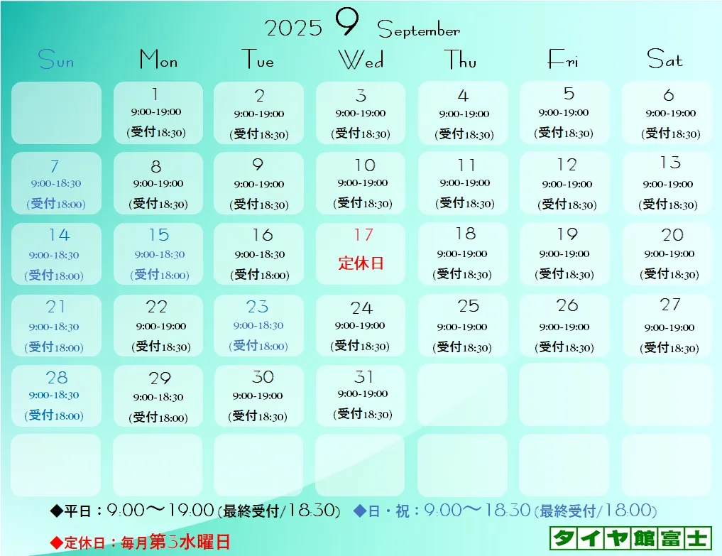 9月営業日 2025/08/30 9月営業日 皆さんこんにちは(^^)/ 9月の営業日程です! 15日(月)・23日(火)が営業時間18:30まで 17日(水)は定休日 来月もよろしくお願いいたします(*'ω'*) #タイヤ館富士 #タイヤ館 #静岡県 #富士市 #ブリヂストン #営業日のお知らせ #営業日