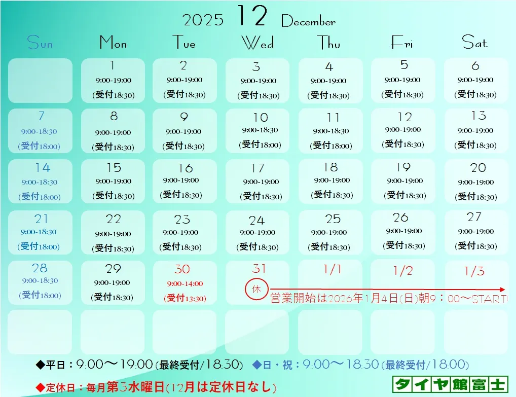 12月の営業日程 12月の営業日程皆さんこんにちは(^^)/12月の営業日程です!12月は定休日なしで第三水曜日も営業しております!30日(火)最終受付13:30/営業14:00までとなっておりまして31日(水)~2026年1月3日(土)までお…